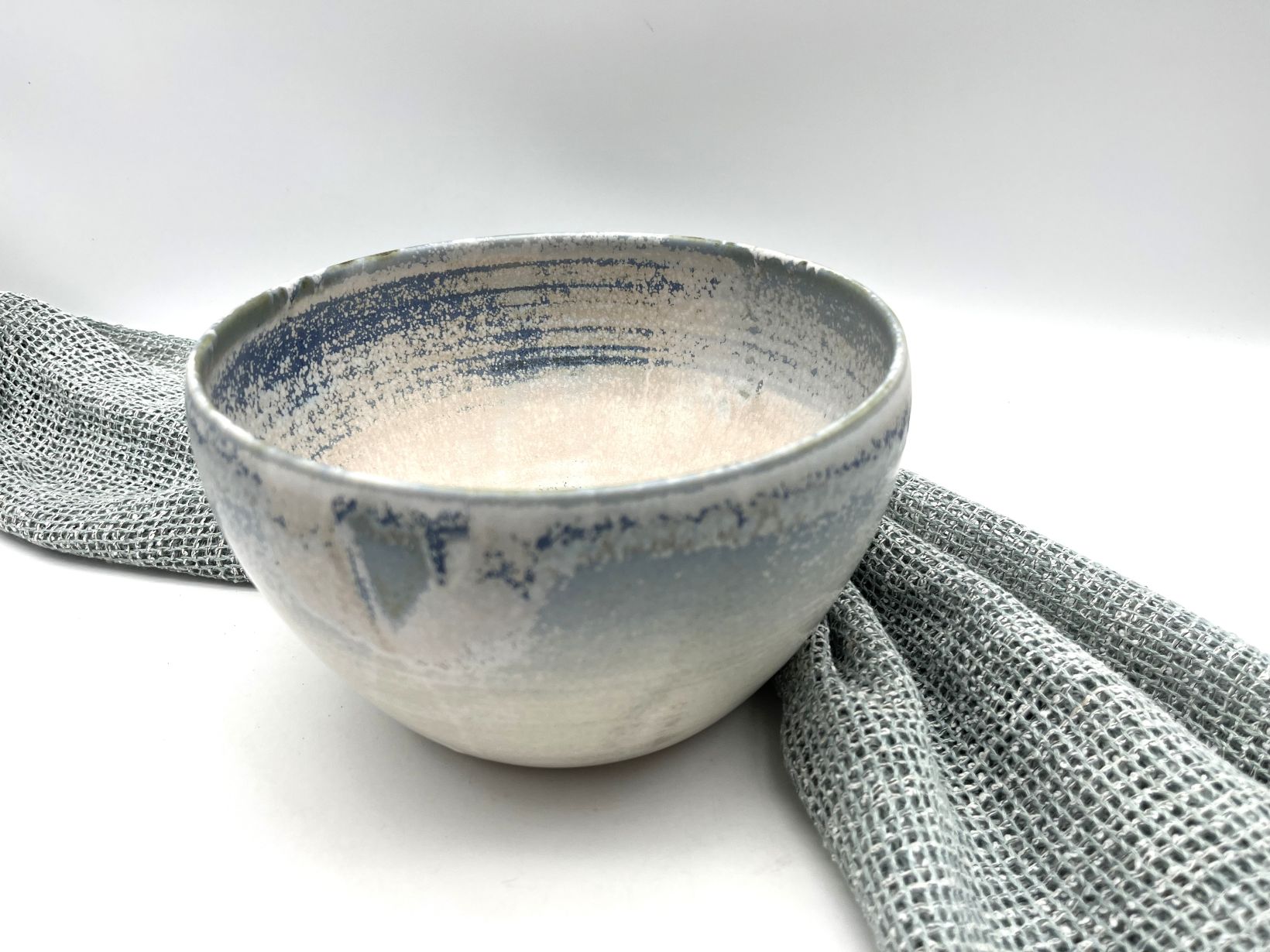 Veidota ar rokām uz podnieka ripas no baltās akmens masas. No kolekcijas “PELĒKĀ ROMANTIKA”. Glazēta ar divām savstarpēji saplūstošām glazūrām veidojot zilgani pelēku, romantisku noskaņu. Tonālās nianses katrai bļodai var nedaudz atšķirties. Apdedzināšanas temperatūra – 1250°C. Izmantotā glazūra ir videi un cilvēka veselībai draudzīga bez kaitīgiem piemaisījumiem.