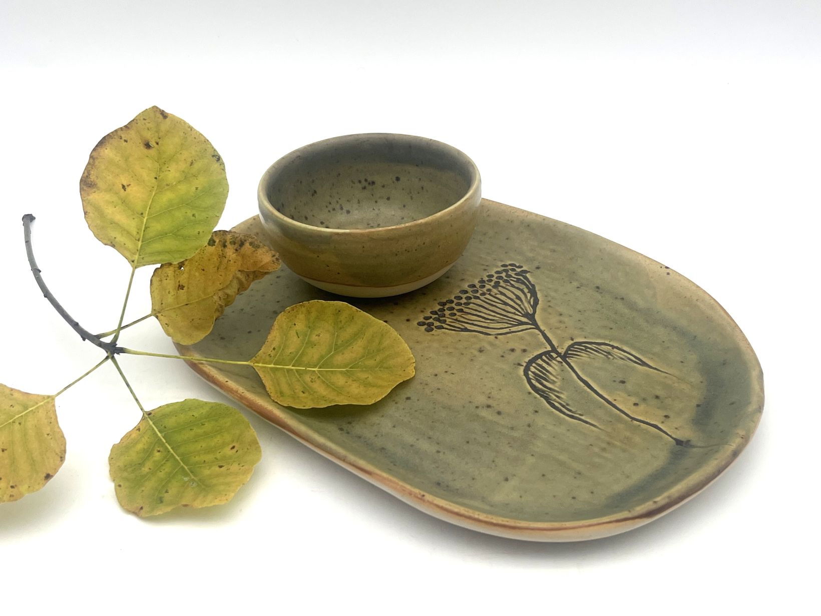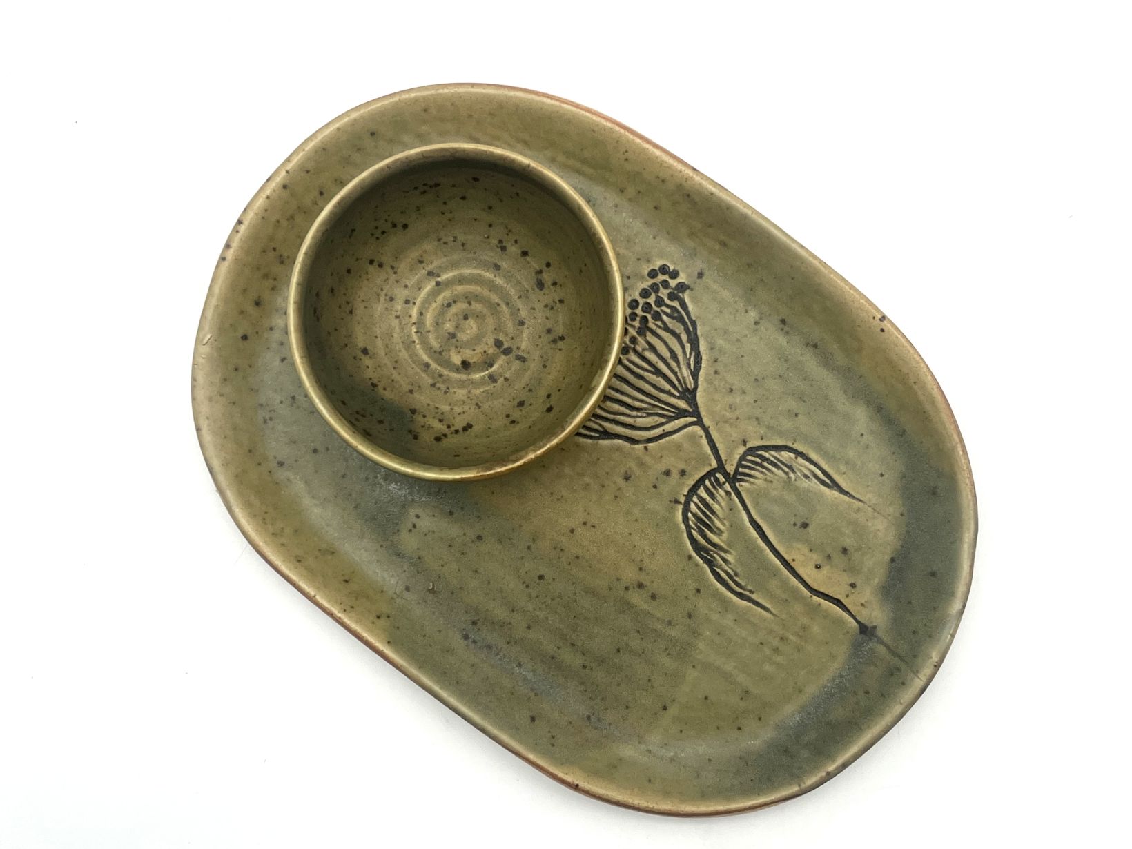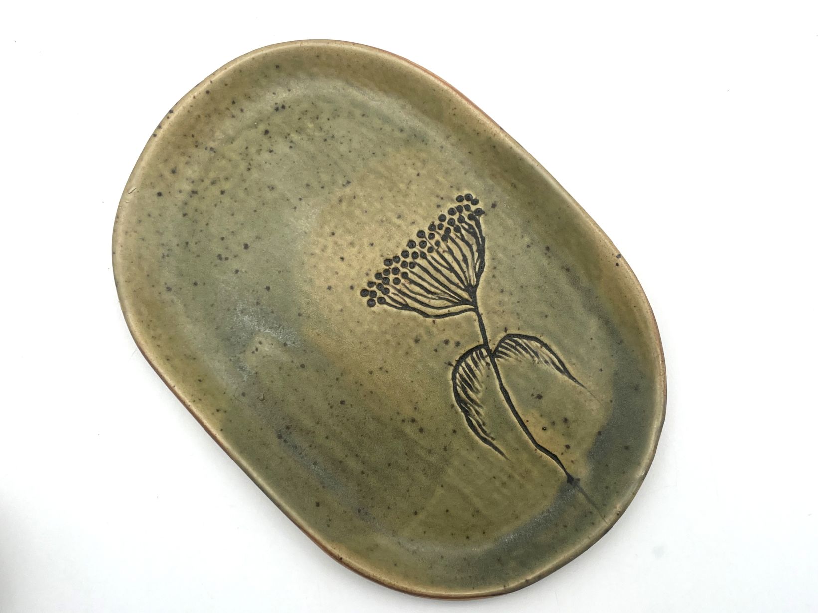 Trauks veidots ar rokām uz podnieka ripas no baltās akmens masas. Šķīvis veidots ar rokām plastu tehnikā un dekorēts ar rokām gravēšanas tehnikā. Apdedzināšanas temperatūra 1250 °C. No kolekcijas RĀMUMS. Izmantotā glazūra ir videi un cilvēka veselībai draudzīga bez kaitīgiem piemaisījumiem.