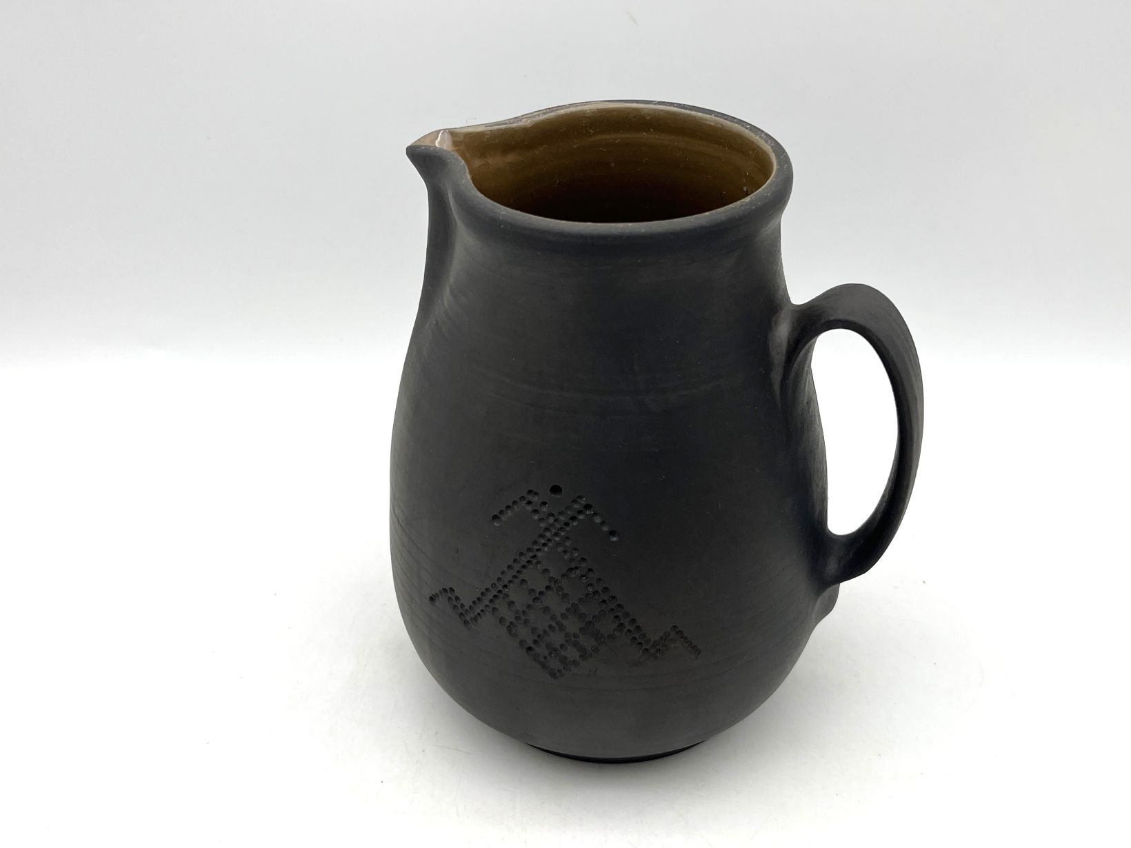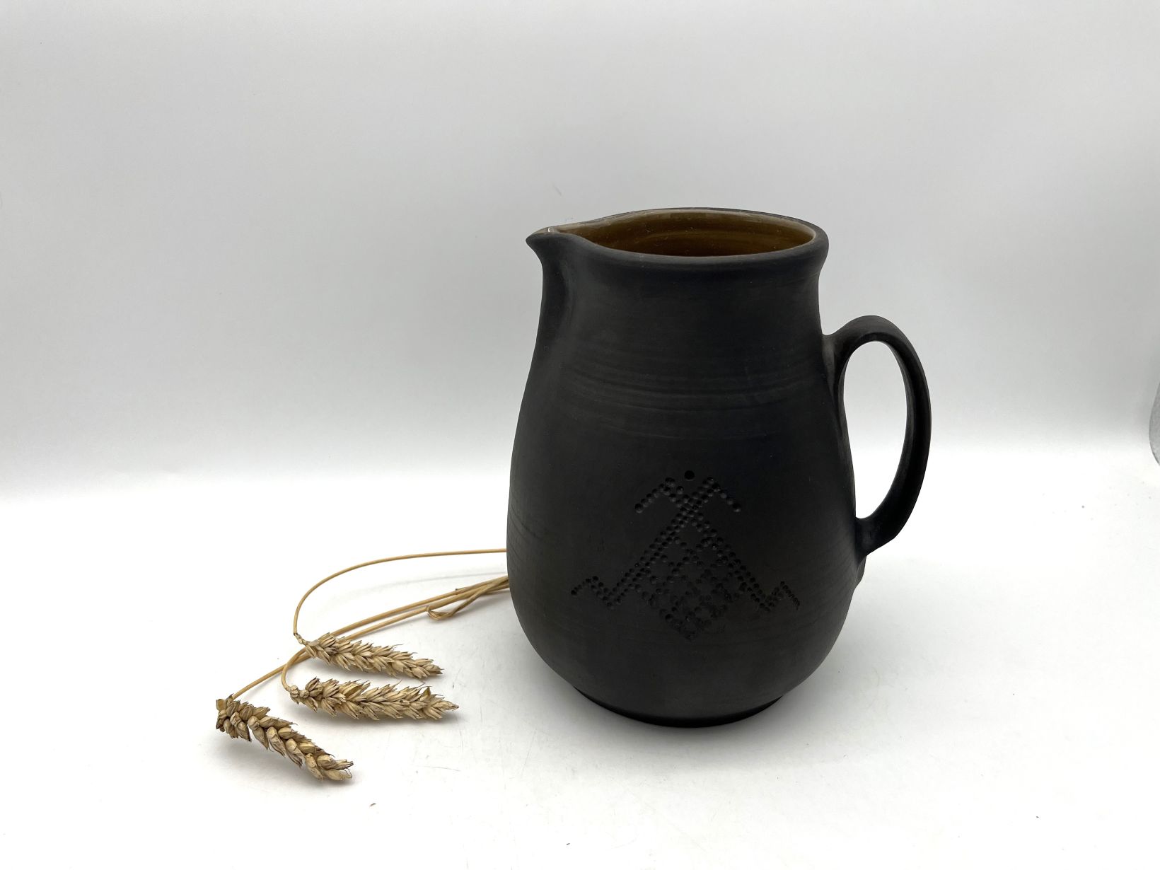 Veidota ar rokām uz podnieka ripas no Latvijas māla un apdedzināta atklātās uguns krāsnī melnajā/svēpētajā tehnikā. Apdedzināšanas temperatūra 1050 °C. Dekorēts gravēšanas tehnikā, izmantojot latvju rakstu zīmju motīvus. Krūzes iekšpuse glazēta. Izmantotā glazūra ir videi un cilvēka veselībai draudzīga bez kaitīgiem piemaisījumiem.