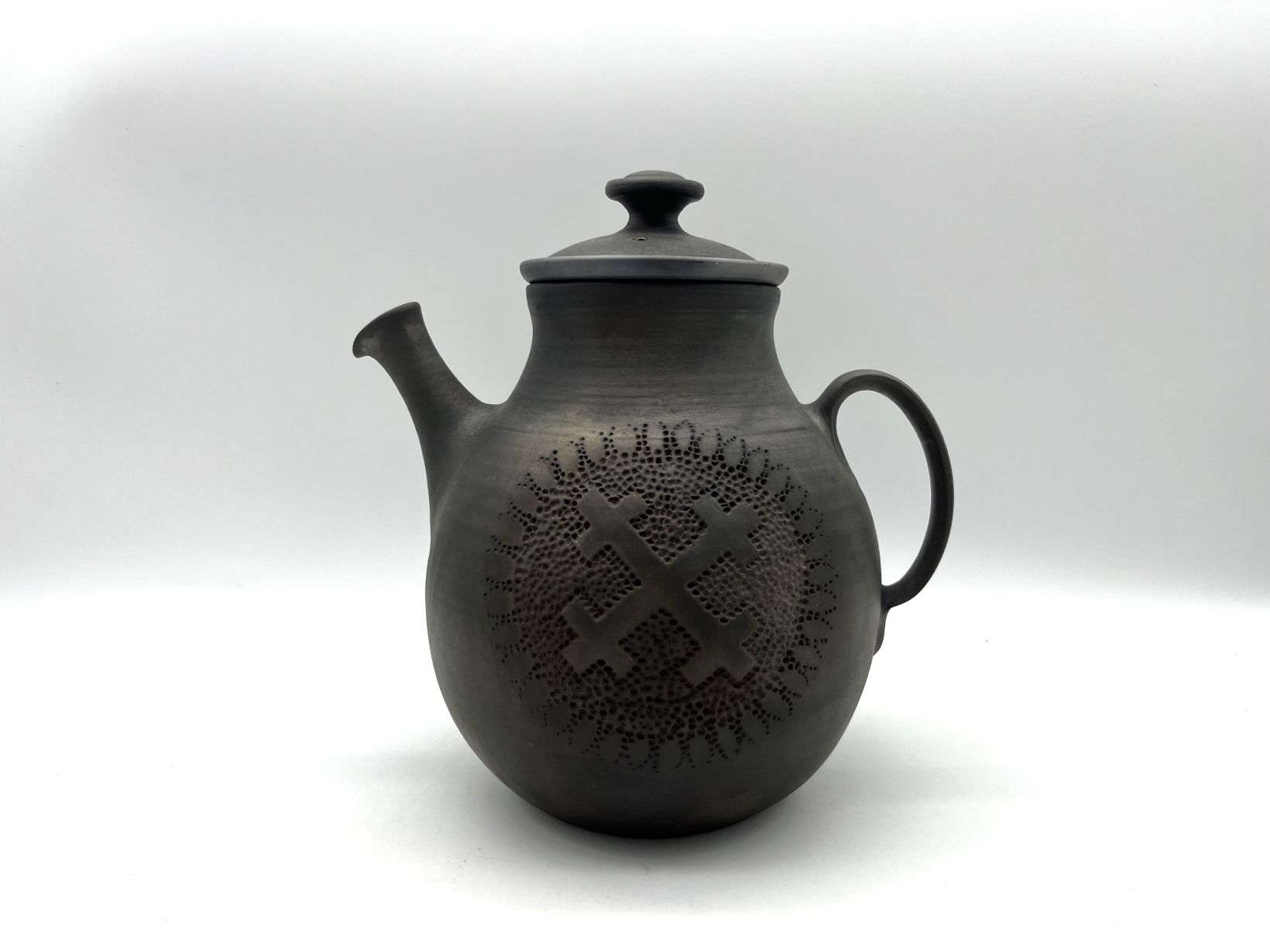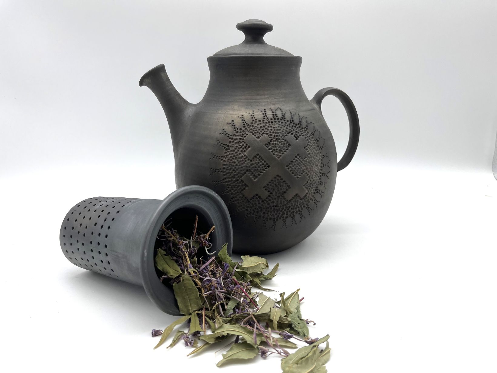 Veidota ar rokām uz podnieka ripas no Latvijas māla un apdedzināts atklātās uguns krāsnī melnajā/svēpētajā tehnikā. Apdedzināšanas temperatūra 1050 °C. Dekorēts gravēšanas tehnikā, izmantojot latvju rakstu zīmju motīvus. Māras krusts. Māra ir saistīta ar māju, uguni un auglību. Māra ir materiālās pasaules aizgādne, rūpējas, lai uz zemes ir pārtikusi un laimīga dzīve. Tējkannas iekšpuse glazēta. Izmantotā glazūra ir videi un cilvēka veselībai draudzīga bez kaitīgiem piemaisījumiem.