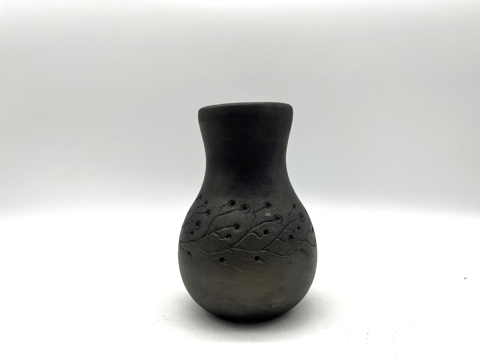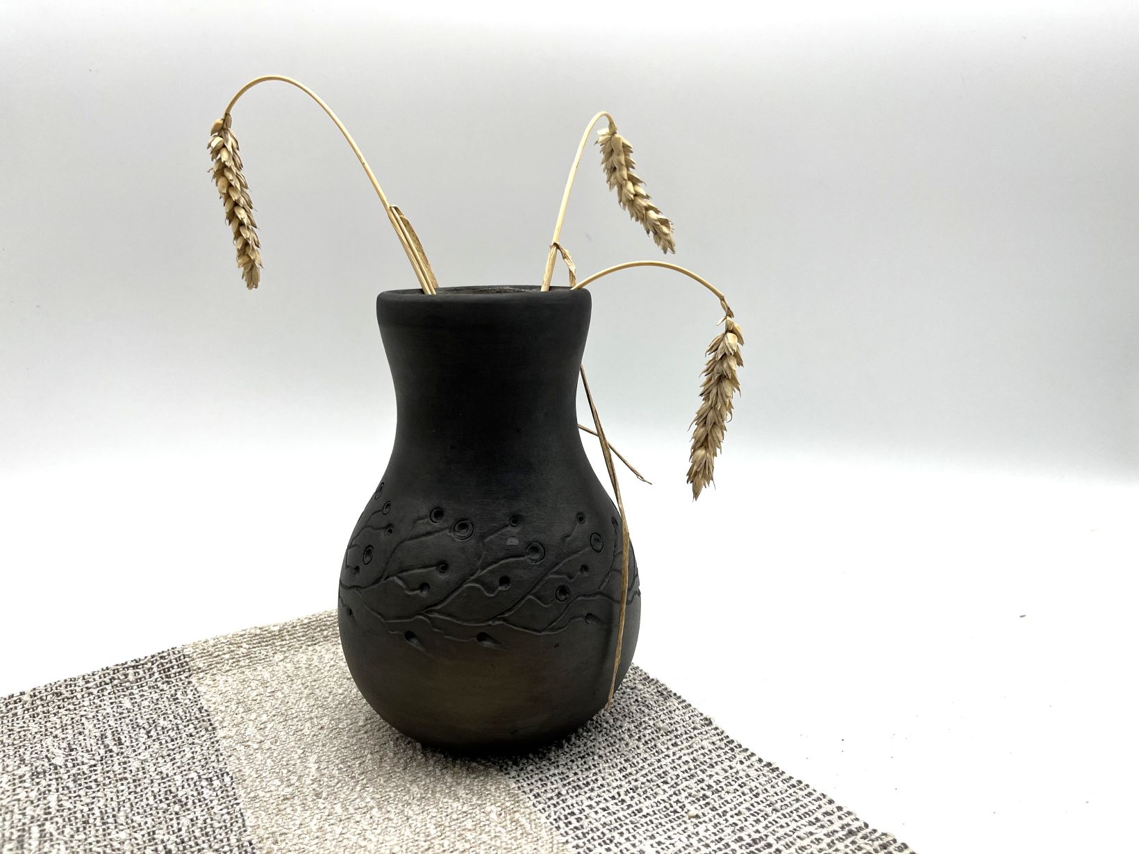 Veidota ar rokām uz podnieka ripas no Latvijas māla un apdedzināta atklātās uguns krāsnī melnajā/svēpētajā tehnikā. Apdedzināšanas temperatūra 1050 °C. Dekorēta ar rokām gravēšanas tehnikā, izmantojot dabas rakstu motīvus. Vāzes iekšpuse glazēta. Izmantotā glazūra ir videi un cilvēka veselībai draudzīga bez kaitīgiem piemaisījumiem.